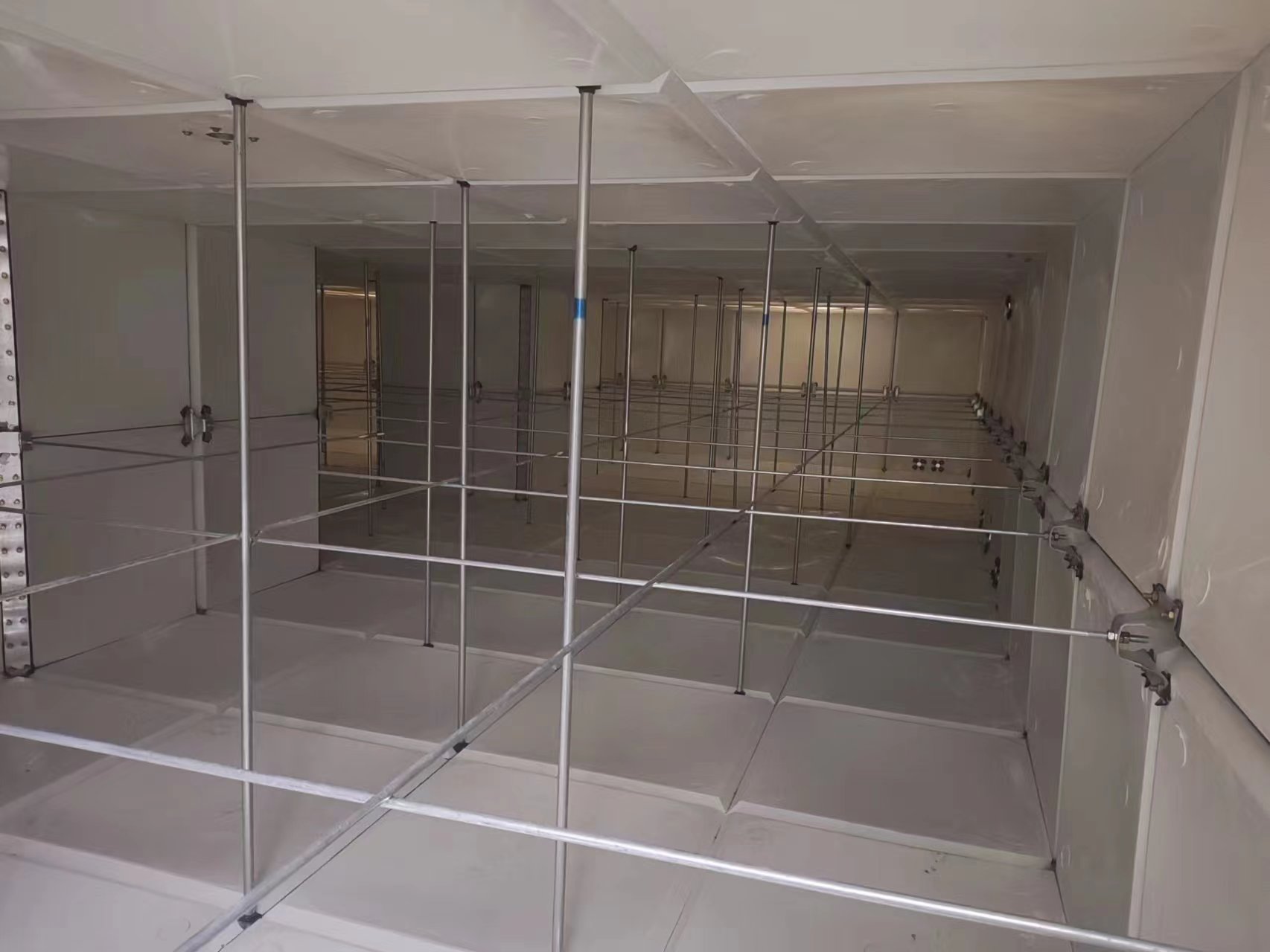 裝配式玻璃鋼水箱設計內加強結構型式,型板拼裝交叉部位設計雙向加強聯桿。箱體側板與底板間設置垂直加固柱,水箱側板四周外型板簡設置求平加強板,加強材料同箱體材料。水箱底部設置鍍鋅槽鋼支每層相鄰。架。水箱附件有檢查孔、內外扶梯、工藝管口、材料均為不銹鋼,水箱工藝管口按用戶提供的圖樣設計。