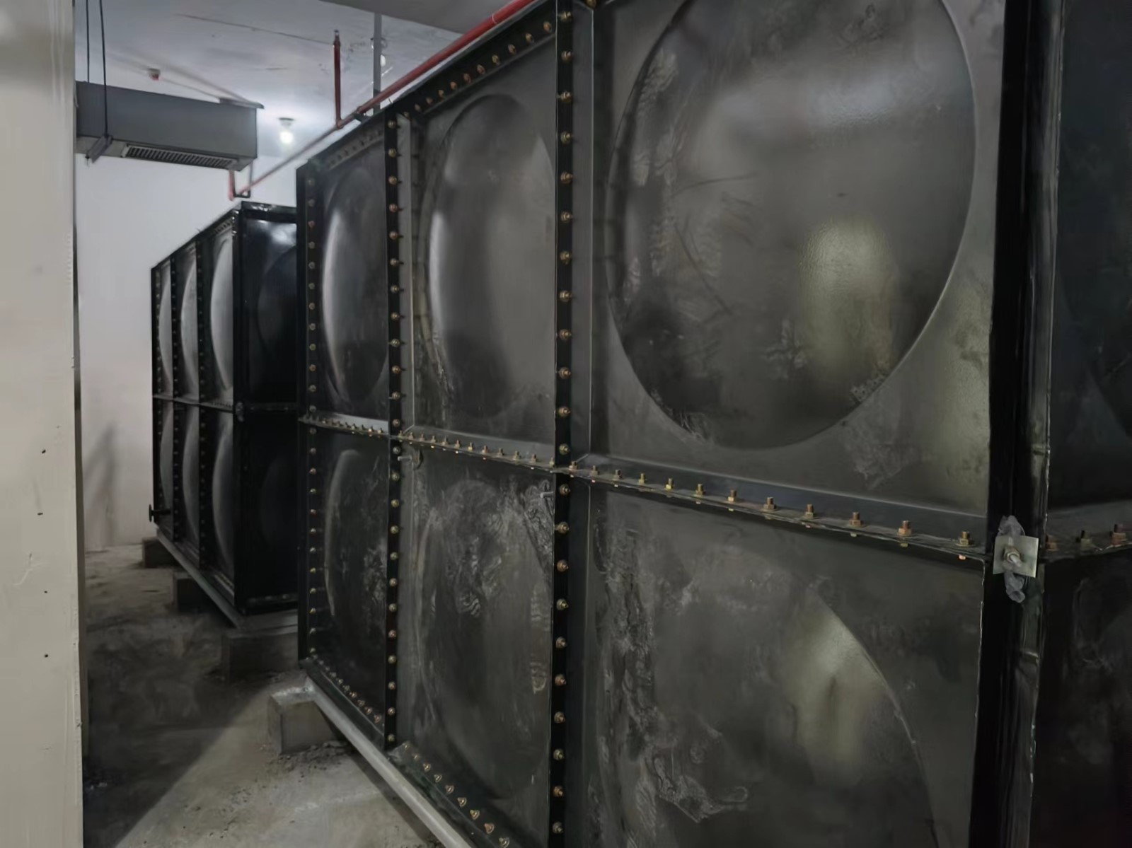 我司承接的江蘇常州市長寧區萬象城搪瓷鋼板油箱項目已安裝完成。裝配式式搪瓷鋼板儲油箱采用Q235鋼板,沖壓形成1000×1000和1000×500的標準塊,周邊鉆孔,經高溫燒結搪瓷處理,現場進行組裝,組裝時標準塊之間采用耐油膠墊密封,螺栓連接。